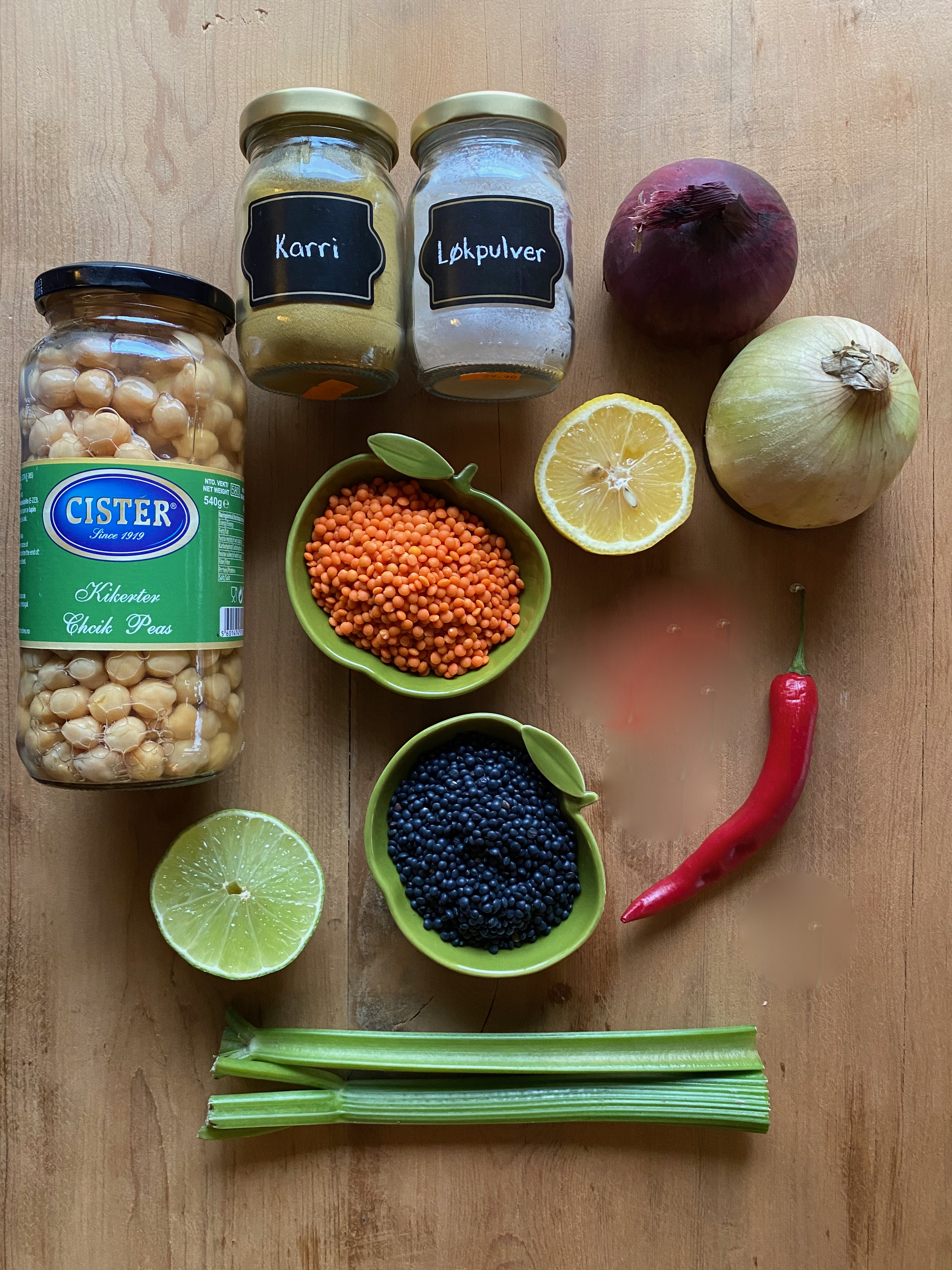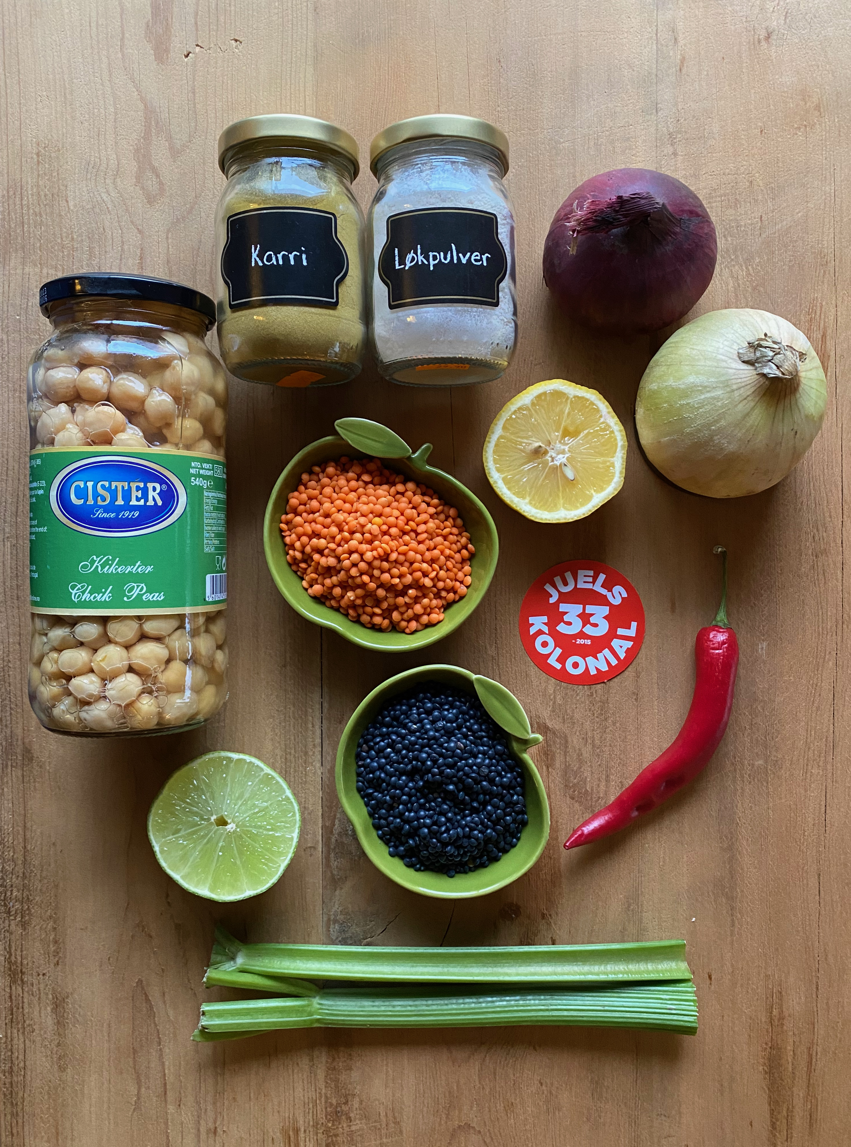 Hell linser og kikerter i kjelen, og tilsett grønnsakskraft.