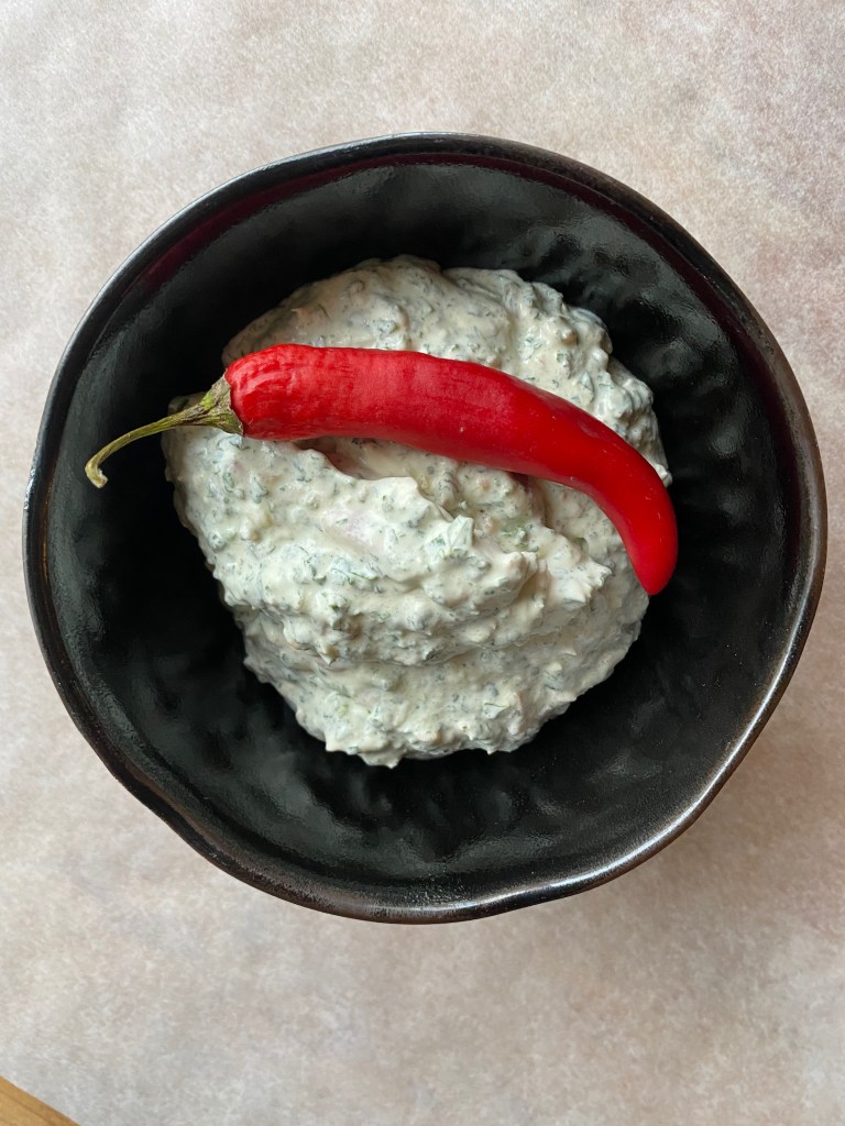 Smak til med litt rødløk, litt hakket grønn chili etter smak, ½ presset sitron per person.